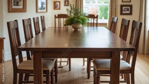 A large, polished wooden dining table with matching chairs fills a bright, inviting dining room.