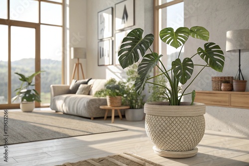 A large potted monstera plant in a decorative pot placed in a bright, modern living room with natural light and cozy decor.