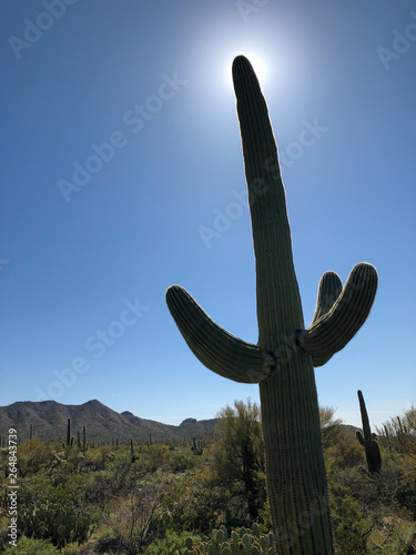 A large saguaro cactus dominates this arid Sonoran desert landscape