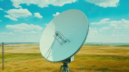A large satellite dish on a field of grass under a blue sky with white clouds.