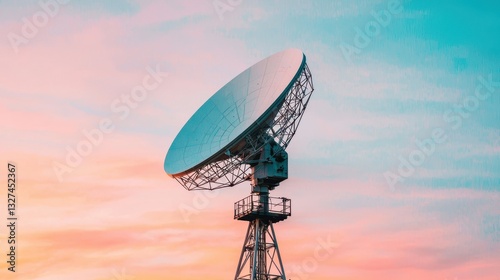A large satellite dish stands against a colorful sky, showcasing technology's role in communication and connectivity.