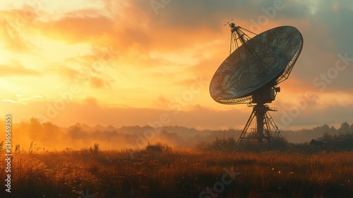 A large satellite dish stands in a field during sunset, surrounded by mist and trees, creating a serene and technological atmosphere.