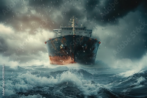 A large ship navigates through turbulent waters under a dramatic stormy sky, showcasing resilience in the face of nature's fury.