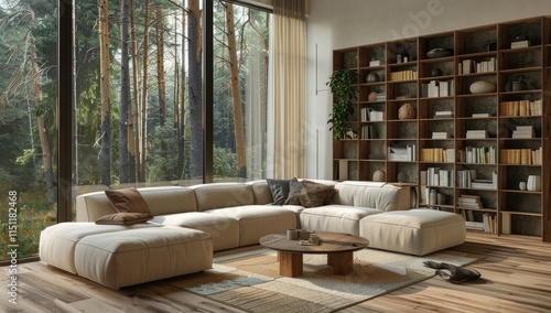 A large spacious living room in a modern style. Interior with a large gray sofa, coffee table, big windows, fireplace in front of the sofa in stylish home decor