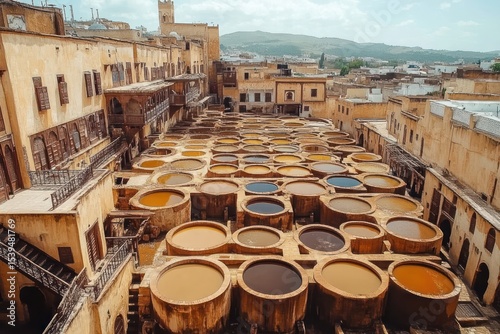 A large traditional tannery with numerous round vats filled with various colored liquids in an old city surrounded by aged buildings under a cloudy sky