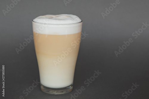 A large transparent glass filled with Latte cooked in a third wave coffee shop is photographed on a gray, isolated background, photo for the menu