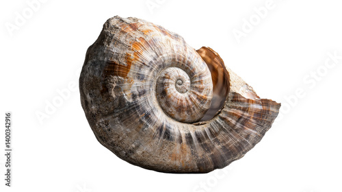 A large, weathered spiral seashell with rough textures and earthy tones, showcasing its natural beauty and imperfections,Transparent background, PNG file