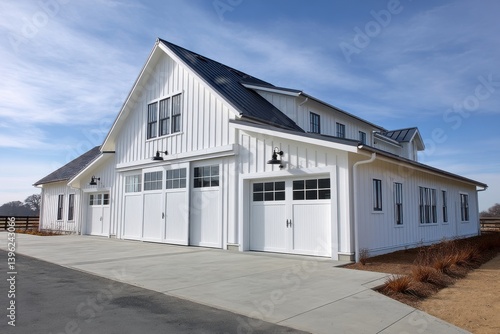 A large white building with multiple garage doors under a bright blue sky on a sunny day outside