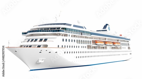 A large white cruise ship with multiple decks and lifeboats, isolated on a white background
