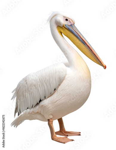 A large, white pelican stands against a white background, its long beak slightly open