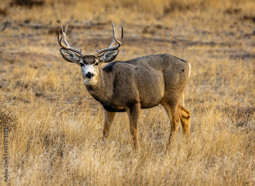 A large white tail buck standing in a meadow in Colorado looking at the camera.