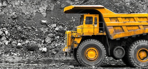 A large yellow mining dump truck is parked near a pile of coal. This heavy duty vehicle is used to transport large quantities of materials in mining operations.