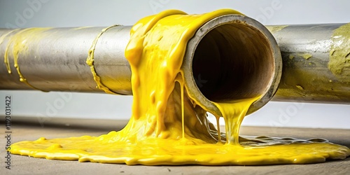 A large yellow puddle of gooey slime slowly drips from a cracked and worn-out metal pipe, pipe, drip, worn