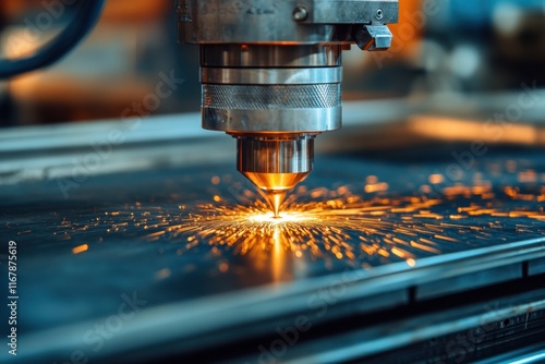A laser cutter operates in a workshop, producing sparks while shaping metal sheets with precision. Generative AI