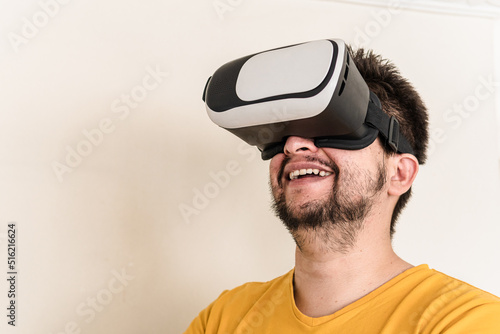 A Latin mid-adult man is wearing a VR Headset and he is happily looking up