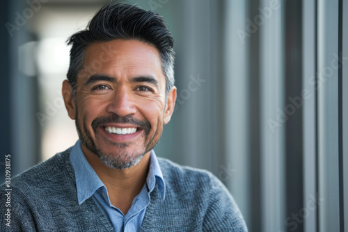 a Latino businessman posing for a portrait with a confident and happy expression, embodying the firm's vision of excellence and success.