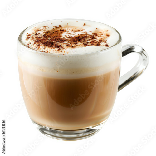 A latte with a swirl of steamed milk and a sprinkle of cinnamon, isolated on white background
