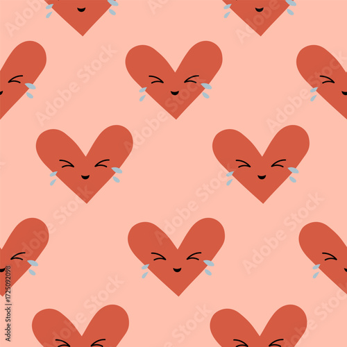 A laughing red heart on a pink background. Vector seamless pattern with hearts. Endless Valentine's Day background, festive design, and fabric.
