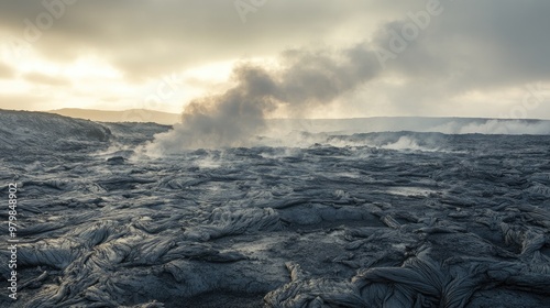 A lava field stretching toward the horizon, with jagged rocks and patches of steam rising from the ground