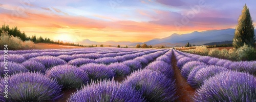 a lavender field bathed in sunset hues, showcasing rows of fragrant blooms.