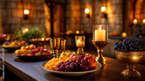 A lavish banquet table adorned with an array of fresh fruits and glowing candles in a grand hall
