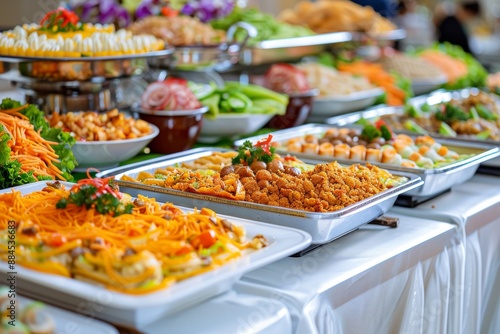 A lavish buffet of gourmet dishes including pastas salads and sides beautifully arranged for a festive and abundant dining experience