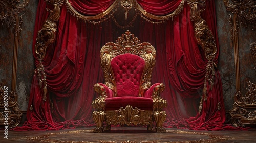 A lavishly designed throne featuring rich red upholstery and ornate gold accents is prominently displayed within a grand room draped in luxurious crimson fabric