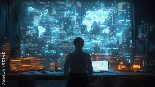 a lawyer examines contracts in a modern office surrounded by holographic displays of legal documents soft blue light illuminates the scene