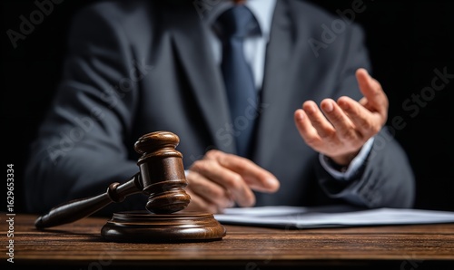 A lawyer is holding the gavel and making a relaxed gesture with his hand while sitting at a desk. Realistic photography of a man wearing a suit, Generative AI.