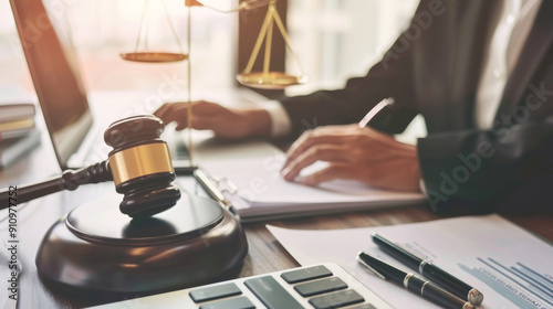 A lawyer works diligently at their desk, surrounded by legal documents, a gavel, scales of justice, and a laptop, symbolizing commitment to justice.