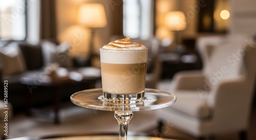 A layered coffee drink likely a latte or cappuccino is presented on a glass stand in a softly lit upscale setting with blurred furniture and lamps