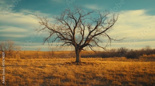 A leafless, dying tree in a desolate field, surrounded by golden grass and illuminated by soft evening light.