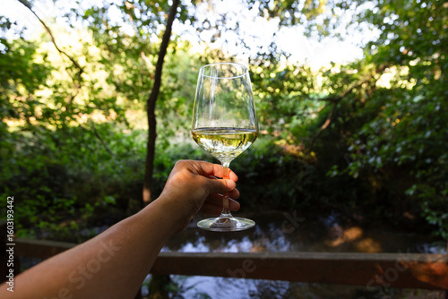 A left hand holds a glass of Albariño wine at the Lores mills in Meaño, Pontevedra.