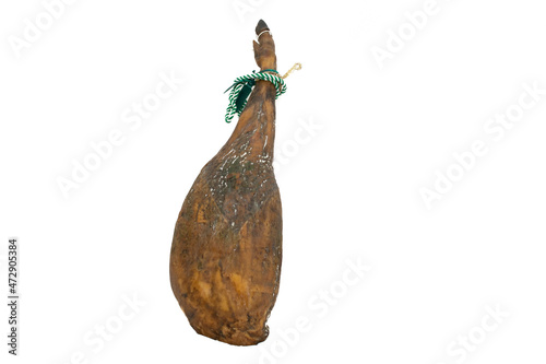 A leg of a Spanish Serrano ham, with a green and white twine, in a vertical position, isolated on white background. With copyspace to the right.