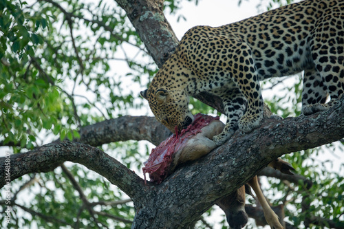 A leopard female and her male cub around a kill. Showing off their athletic nature jumping around and out of trees.