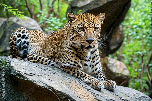 A leopard is laying on a rock in a forest