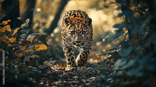 A leopard walking through the forest, with motion blur, wildlife photography, golden hour lighting, bokeh effect, high-resolution photography, nature background, detailed fur texture