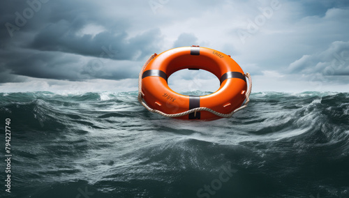 A lifebuoy drifts on the open sea, a symbol of safety and security amidst the vastness of the ocean.