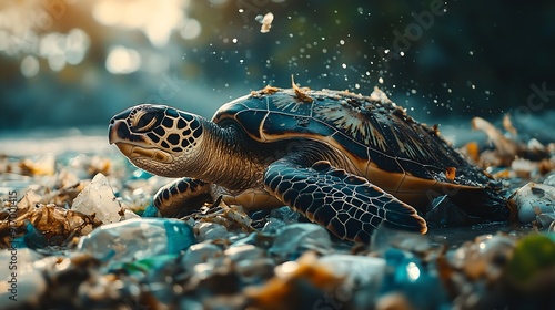 A lifeless sea turtle ensnared in plastic waste highlights the devastating impact of ocean pollution on marine life This poignant image underscores the urgent need for environmental pr : Generative AI