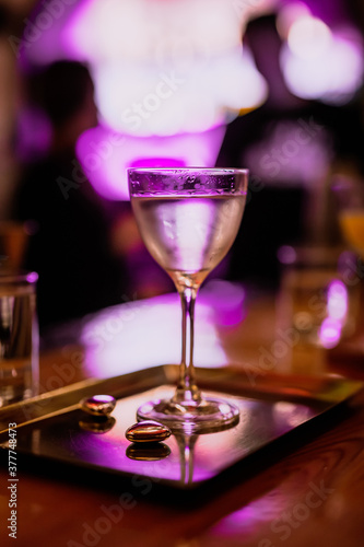 A lifestyle atmospheric photo of a cocktail in a nick and nora glass at the bar in the evening, people in the background, high iso, selective focus
