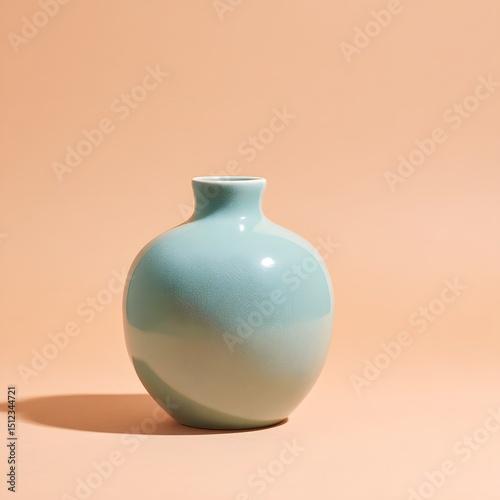 A light blue ceramic vase with a narrow neck sitting on a peach colored surface in soft lighting