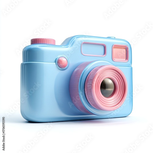 A light blue toy camera with pink accents, rendered in a 3D style against a white background; it has a simple, rounded design
