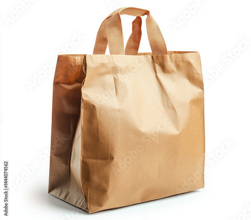 A light brown, reusable shopping bag, with handles. Features a smooth, slightly shiny surface