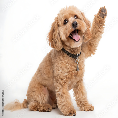 A light brown poodle sitting with its paw raised on a white background looking happy and excited