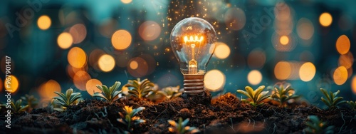 A light bulb is lit up in a field of plants