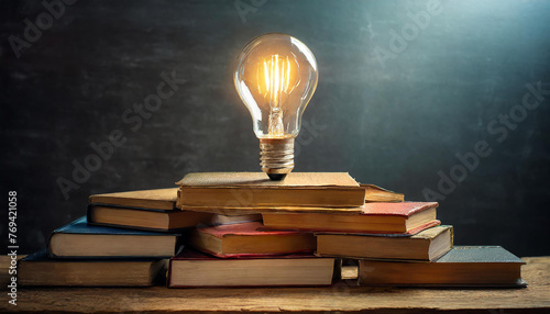 A light bulb is lit up on a table with a stack of books. The light bulb is surrounded by the books, which are arranged in a pyramid shape. Concept of creativity and inspiration