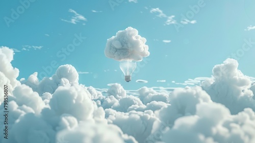 A light bulb shaped like a hot air balloon, floating amongst fluffy clouds that resemble thought bubbles.