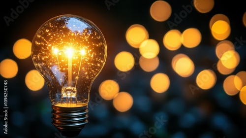 A light bulb shines brightly, illuminating its surroundings, while softly glowing bokeh lights create a warm and inviting atmosphere in the background at night