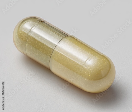 A light golden-tan capsule, slightly glossy, lies on a plain white background