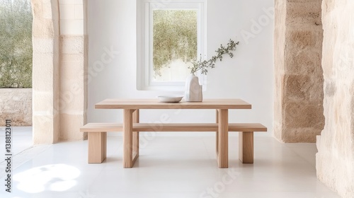 A light oak dining table with two benches sits in a bright, minimalist room. The setting is serene natural light illuminates the space. The image is high quality with sharp focus. The style is clean
